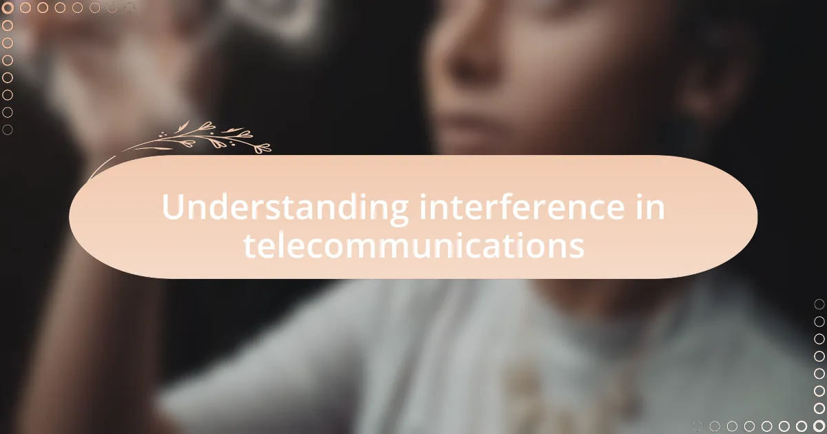 Interference in telecommunications can be a real headache. I recall a time while setting up a home network where I noticed occasional drops in connectivity. It turned out that my neighbor’s Wi-Fi was overlapping with mine, causing significant disruptions. Have you ever faced similar frustrations with your connectivity?